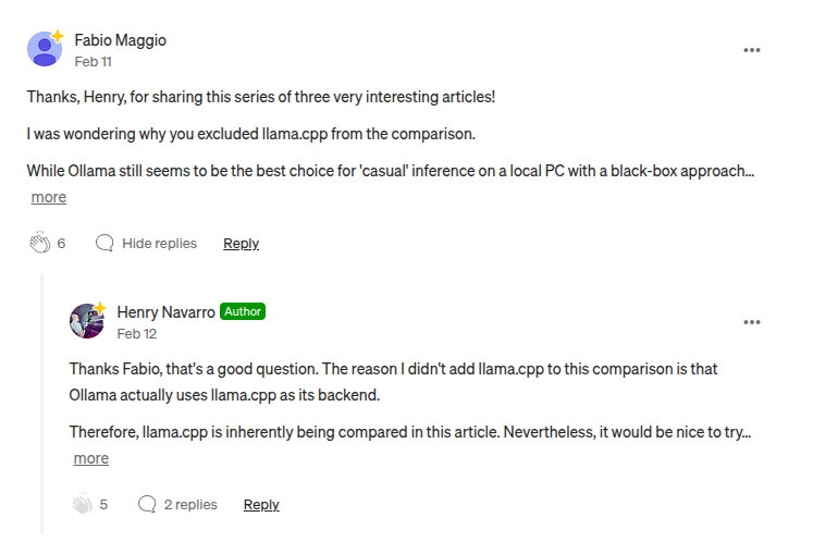 Here’s something interesting: I initially thought Ollama and llamacpp were essentially the same framework or closely related projects. Actually, in a comment I received in this article from the user on medium Fabio Maggio I said they were the same, but I was completely wrong.